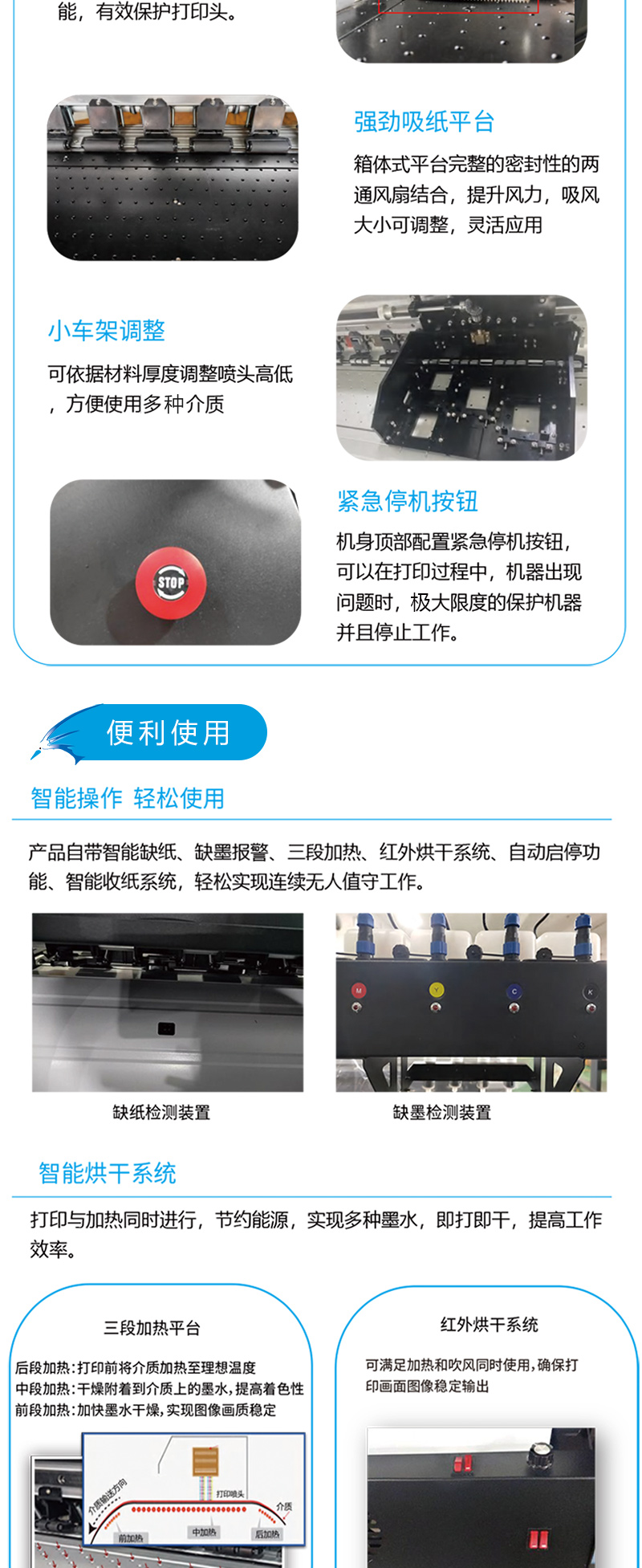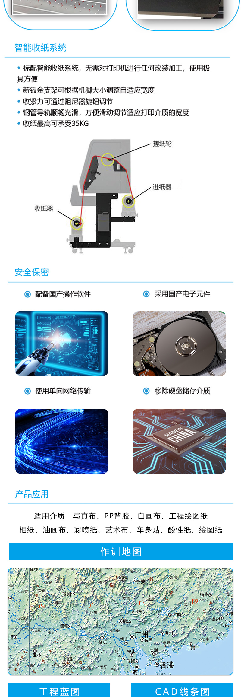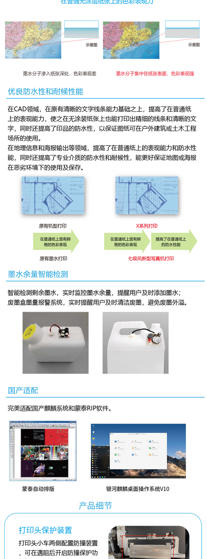 智能墨棧:自動清洗、吸墨、保濕功能,達到最佳的打樣效果,不易斷墨; 大容量墨盒:1.6升大容量墨盒,滿足長時間輸出供墨需求,提高工作效率; 安全保密:采用國產(chǎn)板卡電路,配備國產(chǎn)操作軟件,移除硬盤儲存,保障數(shù)據(jù)安全; 直流無刷電機:配備雙向無刷電機,高精度驅(qū)動線性解碼,精度更高,運行更穩(wěn)定; 智能羽化打?。邯殑?chuàng)二維智能羽化功能,有效解決打印中的pass道,提升打印品質(zhì)高度; 智能烘干系統(tǒng):打印與加熱同時進行,節(jié)約能源,實現(xiàn)多種墨水,即打即干,提高工作效率; 采用國際先進的Hiwin線性導軌系統(tǒng),使機器噪音低,運行平穩(wěn);全自動升降平臺和清洗系統(tǒng),節(jié)省時間精力,工作更高效;智能化設計,兼容多種打印軟件,支持Windows系統(tǒng)軟件直接輸出,使用更加得心應手。