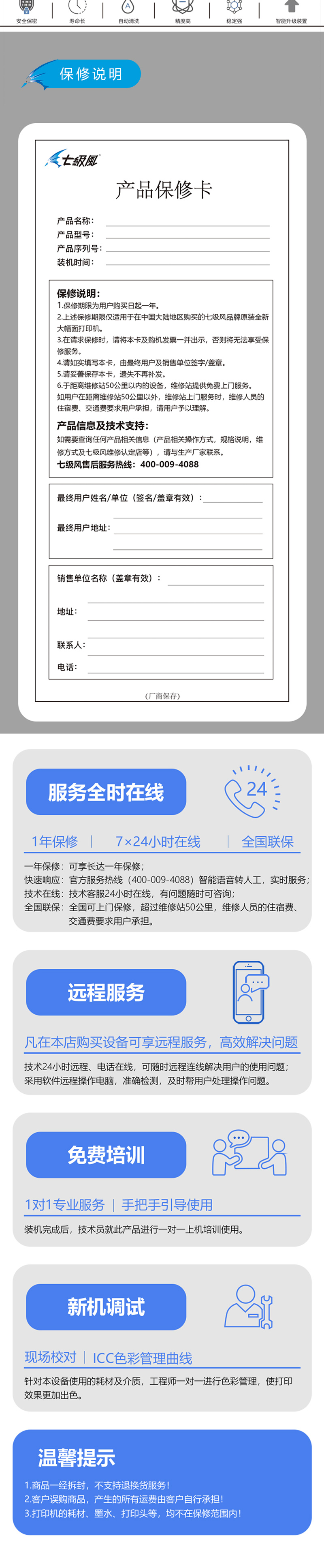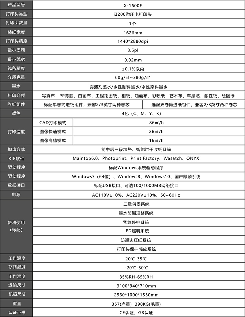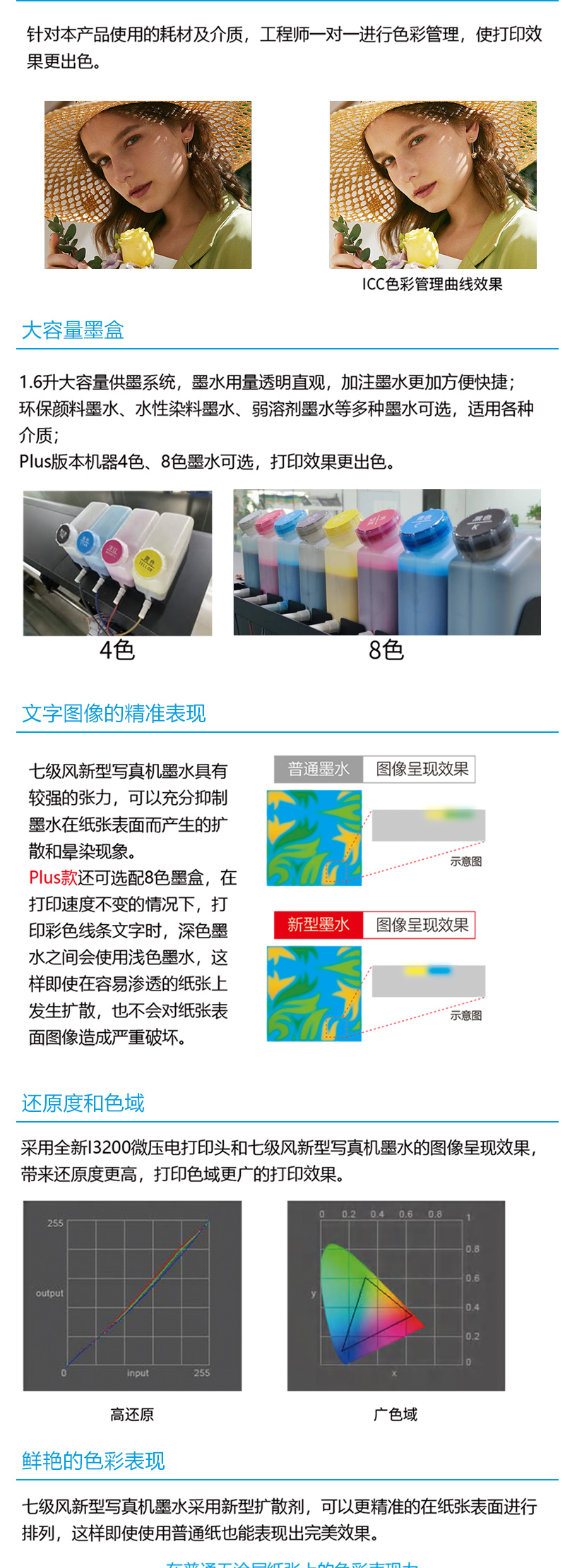 智能墨棧:自動清洗、吸墨、保濕功能,達到最佳的打樣效果,不易斷墨; 大容量墨盒:1.6升大容量墨盒,滿足長時間輸出供墨需求,提高工作效率; 安全保密:采用國產(chǎn)板卡電路,配備國產(chǎn)操作軟件,移除硬盤儲存,保障數(shù)據(jù)安全; 直流無刷電機:配備雙向無刷電機,高精度驅(qū)動線性解碼,精度更高,運行更穩(wěn)定; 智能羽化打?。邯殑?chuàng)二維智能羽化功能,有效解決打印中的pass道,提升打印品質(zhì)高度; 智能烘干系統(tǒng):打印與加熱同時進行,節(jié)約能源,實現(xiàn)多種墨水,即打即干,提高工作效率; 采用國際先進的Hiwin線性導軌系統(tǒng),使機器噪音低,運行平穩(wěn);全自動升降平臺和清洗系統(tǒng),節(jié)省時間精力,工作更高效;智能化設計,兼容多種打印軟件,支持Windows系統(tǒng)軟件直接輸出,使用更加得心應手。