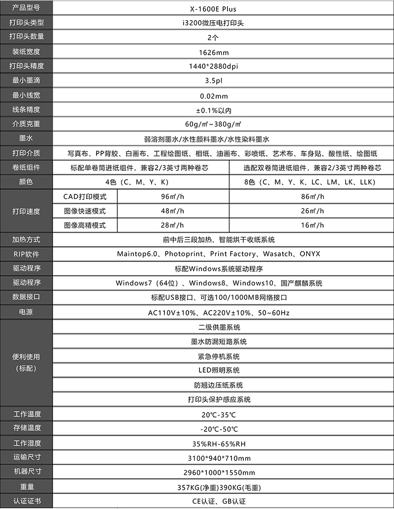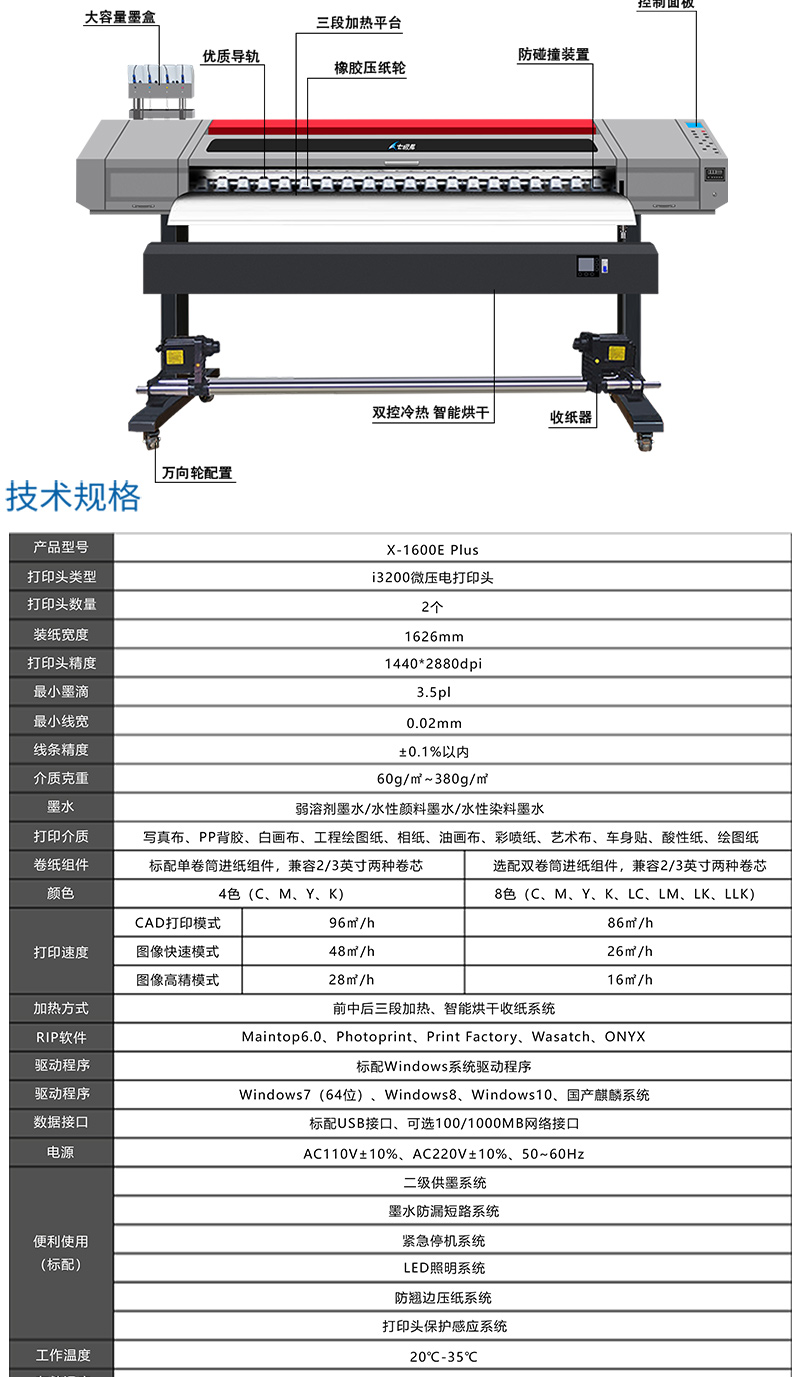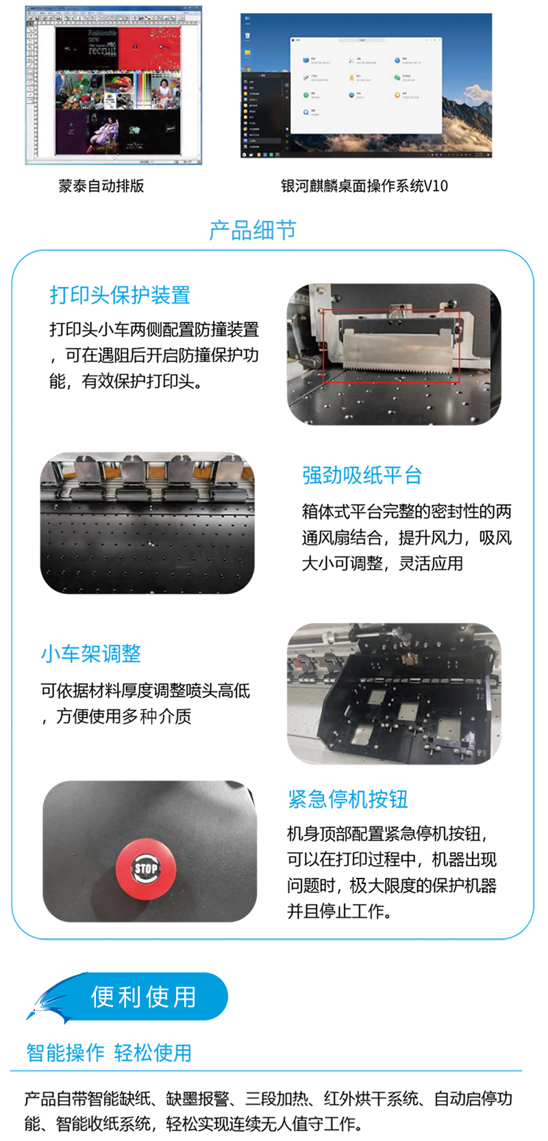 智能墨棧:自動清洗、吸墨、保濕功能,達到最佳的打樣效果,不易斷墨; 大容量墨盒:1.6升大容量墨盒,滿足長時間輸出供墨需求,提高工作效率; 安全保密:采用國產板卡電路,配備國產操作軟件,移除硬盤儲存,保障數據安全; 直流無刷電機:配備雙向無刷電機,高精度驅動線性解碼,精度更高,運行更穩(wěn)定; 智能羽化打印:獨創(chuàng)二維智能羽化功能,有效解決打印中的pass道,提升打印品質高度; 智能烘干系統(tǒng):打印與加熱同時進行,節(jié)約能源,實現(xiàn)多種墨水,即打即干,提高工作效率; 采用國際先進的Hiwin線性導軌系統(tǒng),使機器噪音低,運行平穩(wěn);全自動升降平臺和清洗系統(tǒng),節(jié)省時間精力,工作更高效;智能化設計,兼容多種打印軟件,支持Windows系統(tǒng)軟件直接輸出,使用更加得心應手。