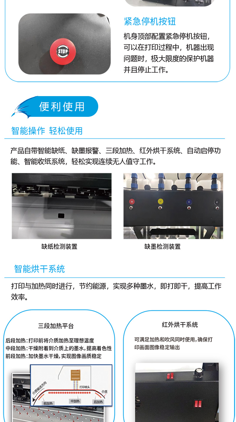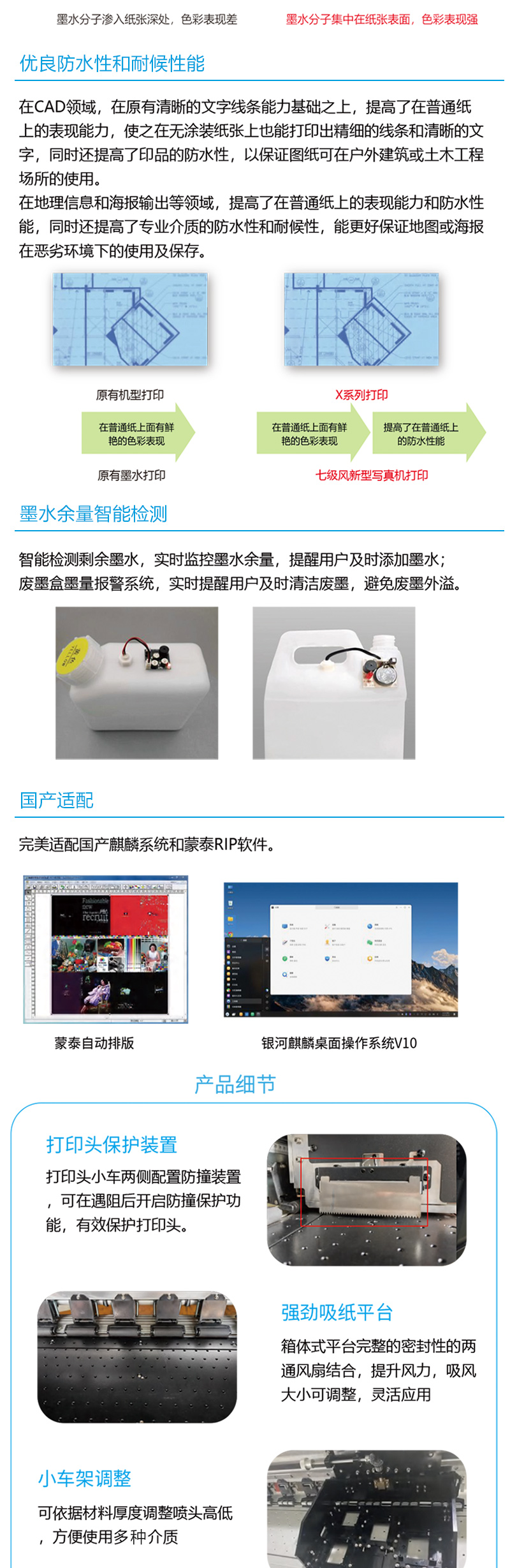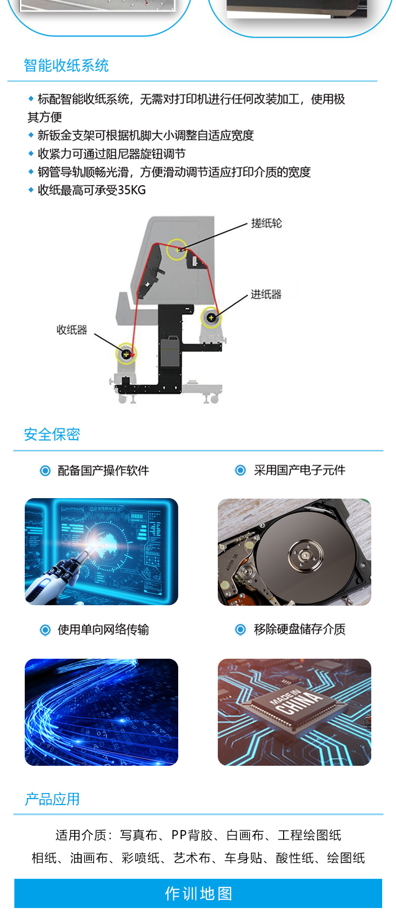 智能墨棧:自動清洗、吸墨、保濕功能,達到最佳的打樣效果,不易斷墨; 大容量墨盒:1.6升大容量墨盒,滿足長時間輸出供墨需求,提高工作效率; 安全保密:采用國產(chǎn)板卡電路,配備國產(chǎn)操作軟件,移除硬盤儲存,保障數(shù)據(jù)安全; 直流無刷電機:配備雙向無刷電機,高精度驅動線性解碼,精度更高,運行更穩(wěn)定; 智能羽化打?。邯殑?chuàng)二維智能羽化功能,有效解決打印中的pass道,提升打印品質高度; 智能烘干系統(tǒng):打印與加熱同時進行,節(jié)約能源,實現(xiàn)多種墨水,即打即干,提高工作效率; 采用國際先進的Hiwin線性導軌系統(tǒng),使機器噪音低,運行平穩(wěn);全自動升降平臺和清洗系統(tǒng),節(jié)省時間精力,工作更高效;智能化設計,兼容多種打印軟件,支持Windows系統(tǒng)軟件直接輸出,使用更加得心應手。
