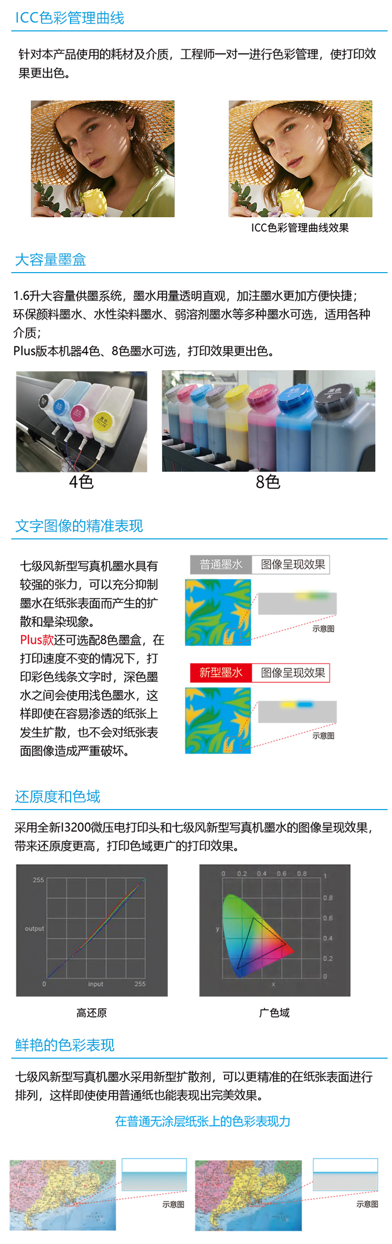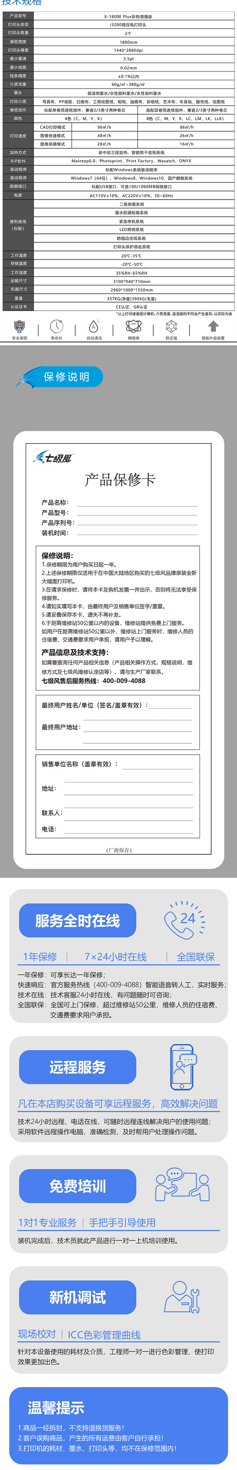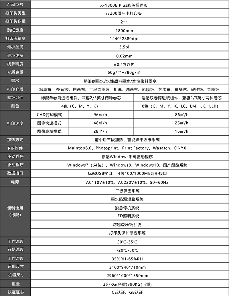 智能墨棧:自動清洗、吸墨、保濕功能,達到最佳的打樣效果,不易斷墨; 大容量墨盒:1.6升大容量墨盒,滿足長時間輸出供墨需求,提高工作效率; 安全保密:采用國產(chǎn)板卡電路,配備國產(chǎn)操作軟件,移除硬盤儲存,保障數(shù)據(jù)安全; 直流無刷電機:配備雙向無刷電機,高精度驅動線性解碼,精度更高,運行更穩(wěn)定; 智能羽化打?。邯殑?chuàng)二維智能羽化功能,有效解決打印中的pass道,提升打印品質高度; 智能烘干系統(tǒng):打印與加熱同時進行,節(jié)約能源,實現(xiàn)多種墨水,即打即干,提高工作效率; 采用國際先進的Hiwin線性導軌系統(tǒng),使機器噪音低,運行平穩(wěn);全自動升降平臺和清洗系統(tǒng),節(jié)省時間精力,工作更高效;智能化設計,兼容多種打印軟件,支持Windows系統(tǒng)軟件直接輸出,使用更加得心應手。